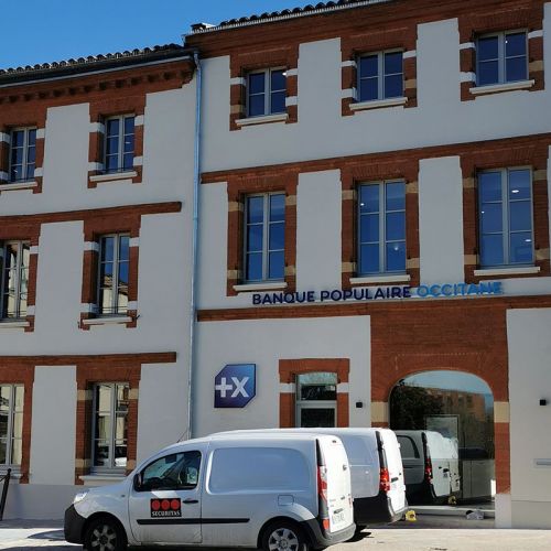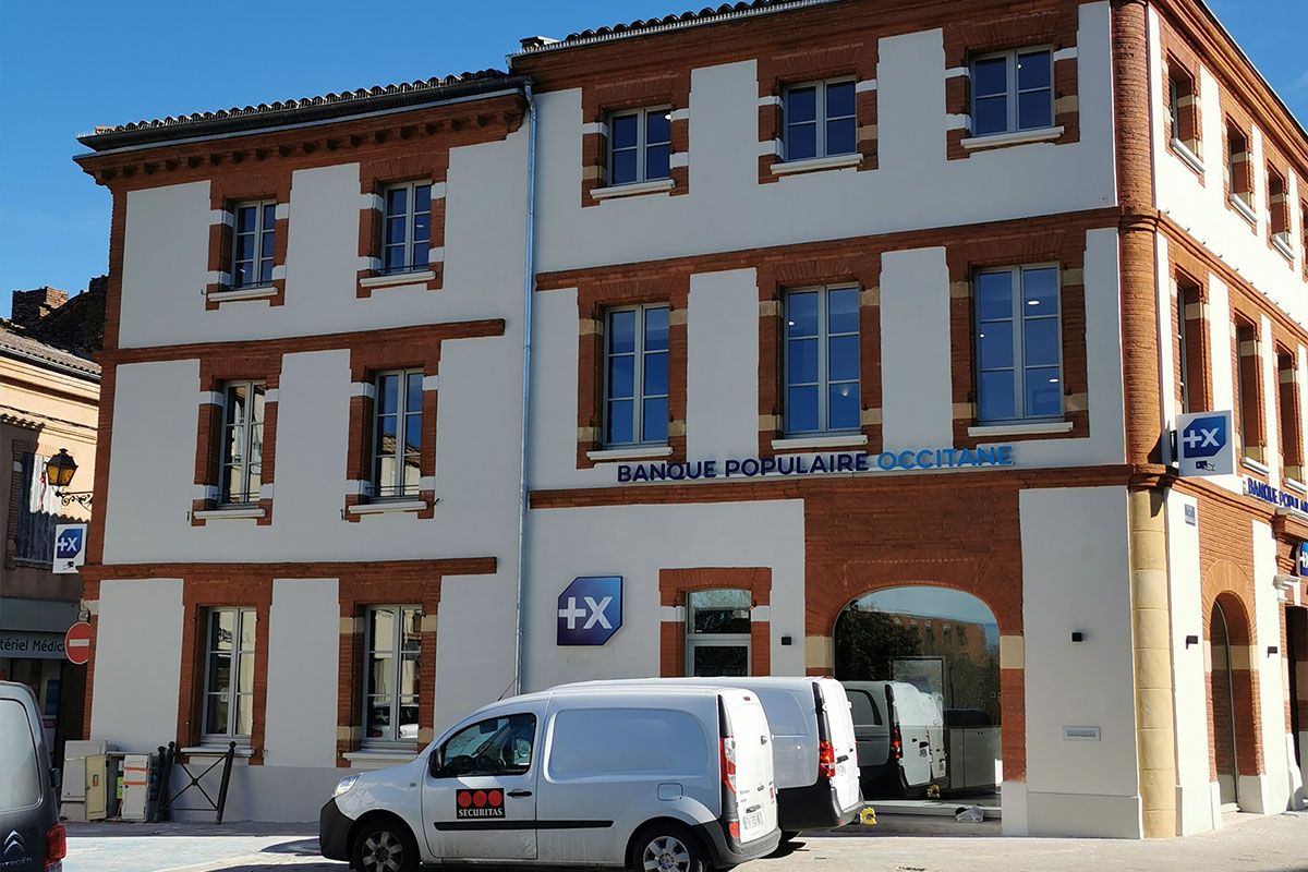 • L’agence de la Place Jeanne d’Arc à Toulouse : purge complète en pied d’immeuble, au cœur de la ville rose, du R-1 au R+1 (seuls le plancher haut du R+1, et les piliers de fondations ont été conservés). Reconstruction complète de l’agence avec une mur d’argent cintré, un R+1 en structure métallique apparente et des menuiseries extérieures hors norme, réalisé dans un délai extrêmement contraint et qui a été respecté (démolition de l’agence et reconstruite de 280 m² de surface plancher sur 3 niveaux, en 5 mois de juillet à novembre) pour livrer une des plus belles agences de Toulouse.